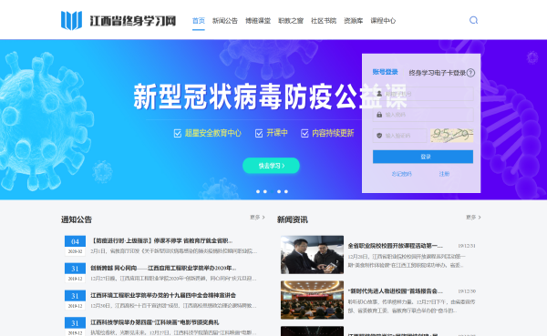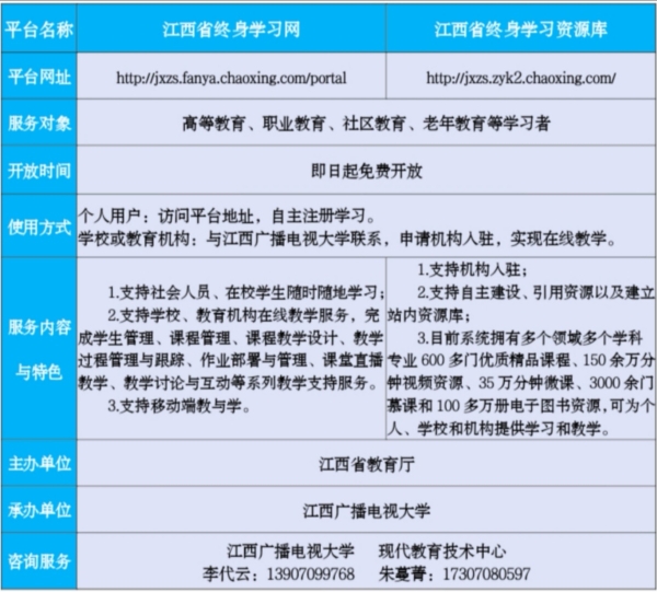 江西省终身学习系统是江西省教育厅主推的、江西广播电视大学负责开发的第三方在线教学平台,由江西省终身学习网和江西省终身学习资源库组成,是基于大数据、人工智能和云服务构建的全省智能化公共教育云平台。系统既整合了国家开放大学、国家数字化学习资源中心和超星图书馆的精品在线学习资源,又有彰显地域产业文化的特色资源,疫情期间又新推出了抗击疫情的专题教育资源,以至为全省乃至全国各类学习者提供便利、灵活、个性化和多元化的学习支持服务,为阻击疫情增添一份力量。