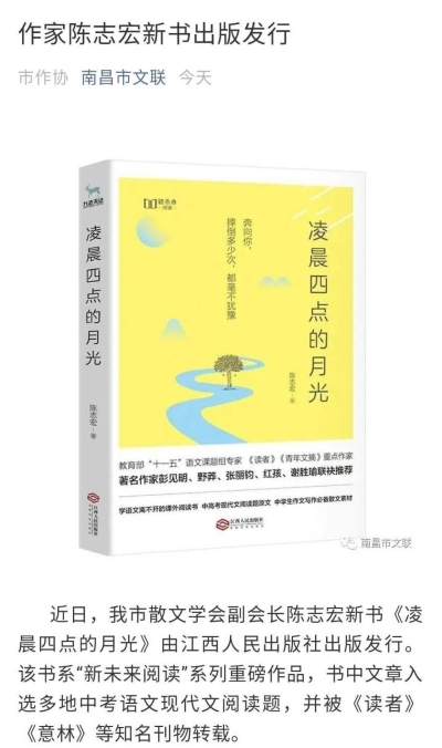 近日,必赢官网教师、南昌市散文学会副会长陈志宏新书《凌晨四点的月光》由江西人民出版社出版发行,南昌市文学艺术界联合会、《南昌晚报》先后进行了相关报道。该书系“新未来阅读”系列重磅作品,书中文章入选多地中考语文现代文阅读题,并被《读者》《意林》等知名刊物转载。