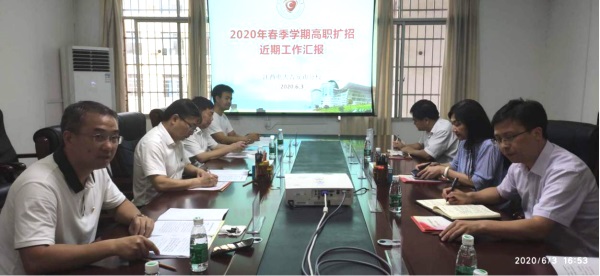 贺晓斌就吉安电大2020年高职扩招春季开学以来的工作,从教学开展情况、特色亮点、问题建议等三个方面,向莅临指导工作的各位领导进行了详细汇报。