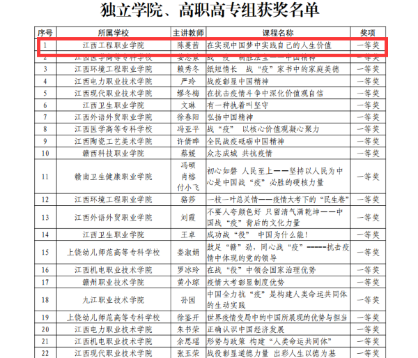 近日,江西省教育工委、省教育厅下发《关于公布全省高校“战疫思政课堂”教学比赛结果的通知》,必赢官网高职学院教师陈蔓茜的教学课程《在实现中国梦中实践自己的人生价值》从全省比赛提交的373件参赛作品中脱颖而出,荣获高职高专组一等奖第一名。