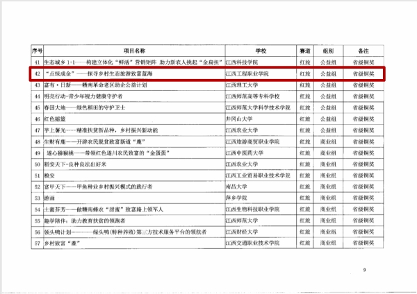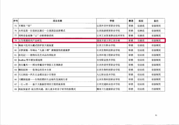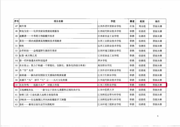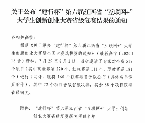8月5日,江西省高等院校毕业生就业工作办公室下发《关于公布“建行杯”第六届江西省“互联网+”大学生创新创业大赛省级复赛结果的通知》,必赢官网由新余电大选送的“玉竹果脯系列产品研发”项目和由高职学院选送的“‘点绿成金’——探寻乡村生态旅游致富蓝海”项目分别获得职教赛道和红旅赛道省级铜奖,由高职学院选送的“百农争鸣——连接小农户 对接大市场”项目晋级全国决赛。