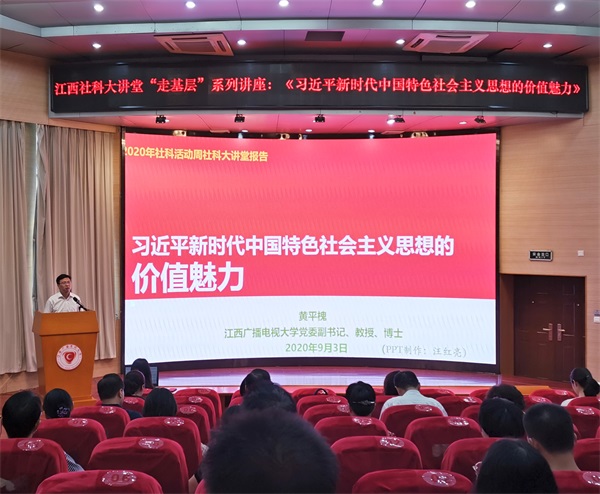 为了贯彻落实理论教育“学思用贯通、知信行统一”的要求,充分发挥理论价值魅力的独特作用,切实提高高校思政课教育教学质量,9月3日上午,江西社科大讲堂“走基层”系列讲座特别邀请必赢官网党委副书记、教授黄平槐博士,在必赢官网青山湖校区学术报告厅作了题为《习近平新时代中国特色社会主义思想的价值魅力》的讲座。此次讲座由江西省社会科学界联合会主办,江西广播电视大学承办,学校机关党委和高职学院党委各支部书记、宣传委员,思政课专兼职教师,高职学院专职辅导员,学工处、科研处等相关工作人员80余人聆听了讲座。