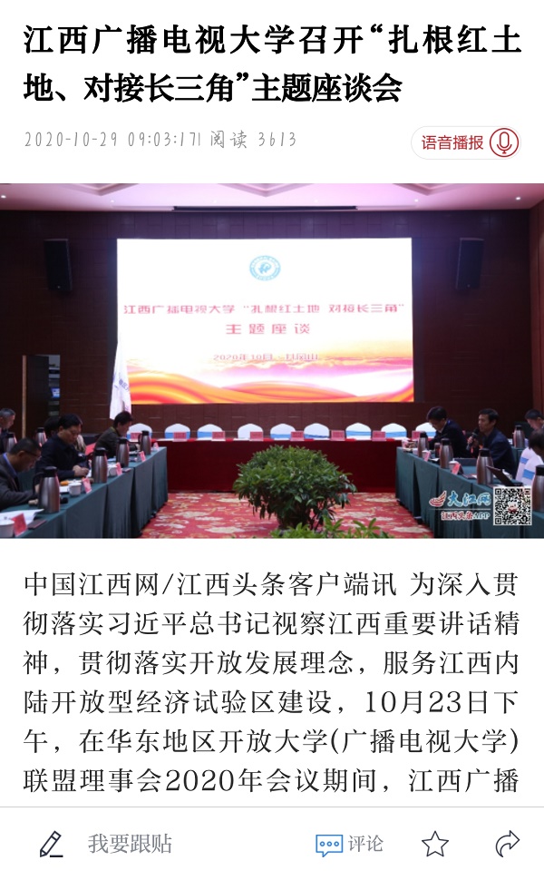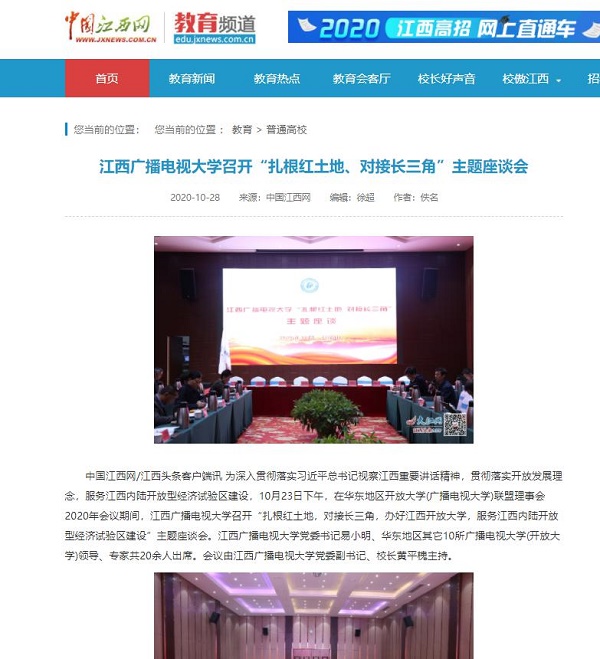 10月23日下午,在华东地区开放大学(广播电视大学)联盟理事会2020年会议期间,江西广播电视大学召开“扎根红土地,对接长三角,办好437必赢会员中心,服务江西内陆开放型经济试验区建设”主题座谈会。近期,中国江西网、江西新闻客户端先后刊载文章《江西广播电视大学召开“扎根红土地、对接长三角”主题座谈会》。