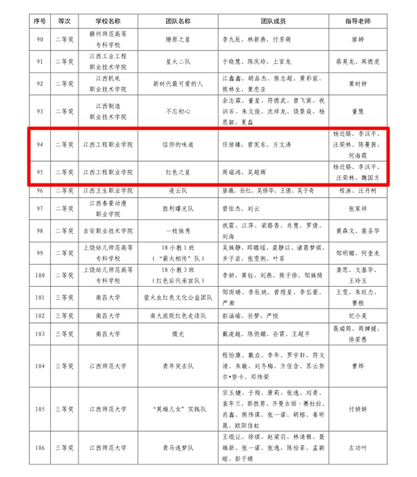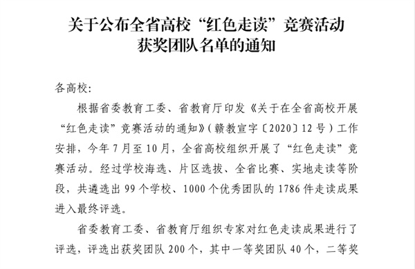 11月19日,江西省教育厅公布了全省高校“红色走读”竞赛活动获奖团队名单,由必赢官网高职学院杨近铬、李汉平、汪荣林、陈蔓茜、何海霞老师指导的“信仰的味道”团队和杨近铬、李汉平、汪荣林、魏国方老师指导的“红色之星”团队荣获二等奖。