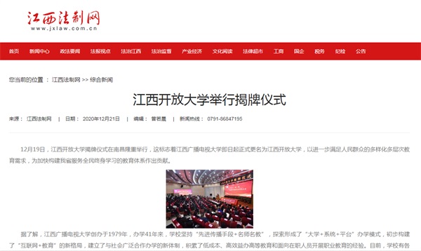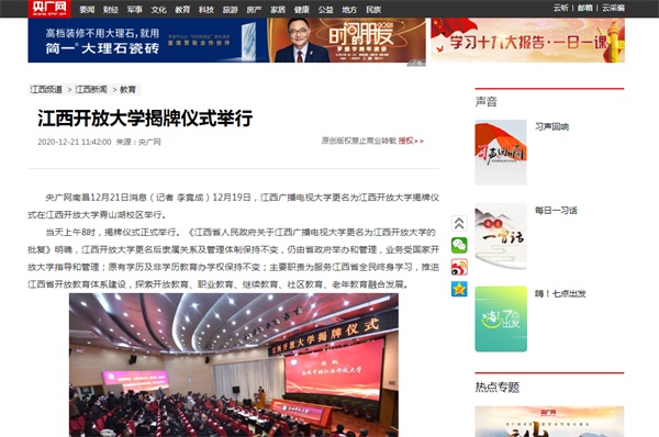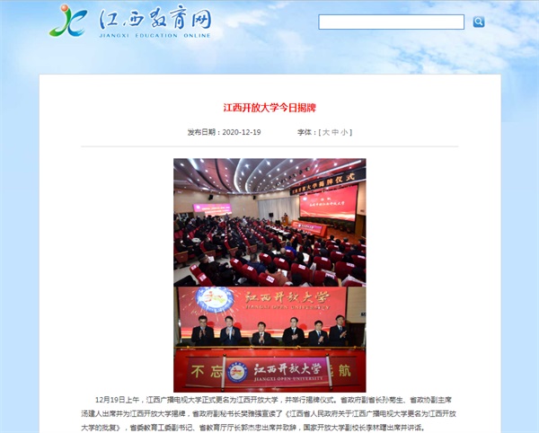 在决胜收官与谋划新局的关键之年,江西省人民政府批准江西广播电视大学更名为437必赢会员中心,实现了全省电大人的夙愿。12月19日-21日,江西日报、“学习强国”学习平台、新华社、人民网等多家主流媒体相继报道437必赢会员中心更名盛况。