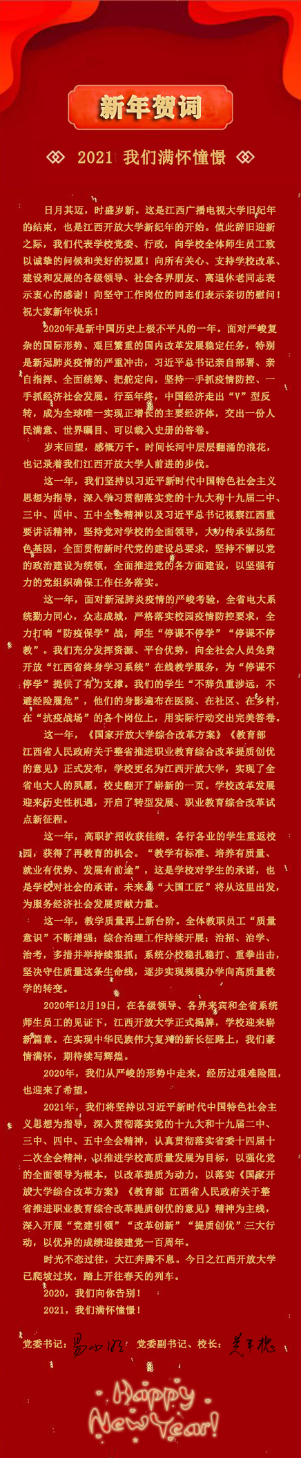日月其迈,时盛岁新。这是江西广播电视大学旧纪年的结束,也是437必赢会员中心新纪年的开始。值此辞旧迎新之际,我们代表学校党委、行政,向学校全体师生员工致以诚挚的问候和美好的祝愿!向所有关心、支持学校改革、建设和发展的各级领导、社会各界朋友、离退休老同志表示衷心的感谢!向坚守工作岗位的同志们表示亲切的慰问!祝大家新年快乐!