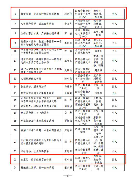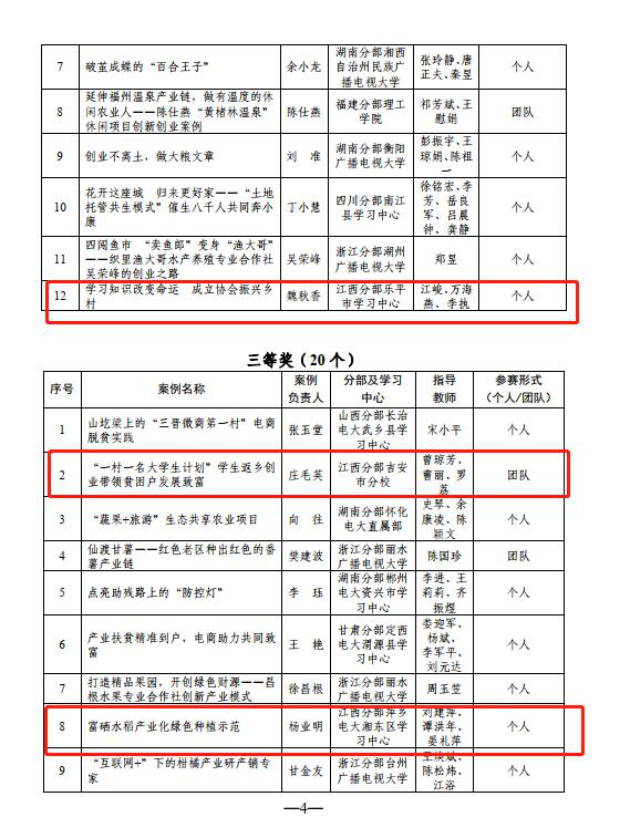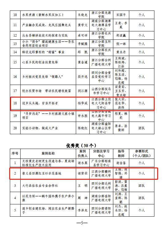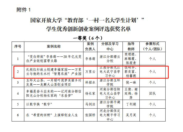 近日,国家开放大学公布国家开放大学“教育部‘一村一名大学生计划’”学生优秀创新创业案例评选结果,必赢官网学生申报的案例获得一等奖1名,二等奖1名,三等奖3名,优秀奖5名。其中,万里云《扎根红杉故土创建幸福家园——万里云与他的长水村“智慧农旅”产业园》荣获一等奖,魏秋香《学习知识改变命运 成立协会振兴乡村》荣获二等奖,庄毛英《“一村一名大学生计划”学生返乡创业带领贫困户发展致富》、杨业明《富硒水稻产业化绿色种植示范》、杨华成《迈步从头越,甘当开拓者》荣获三等奖,谢贤荣《崇义县田源红豆杉示范基地》、邓龙仔《新型农业 走出农村经济发展新路》、李松林《挖掘乡村优势重塑太平盛景——李松林与他的太平山茶情缘》、陈小红《大棚麒麟西瓜种植》、贺小云《在家门口的百姓致富合作社》荣获优秀奖。必赢官网教师饶明华等29人获得优秀指导教师称号,必赢官网获得优秀组织奖。