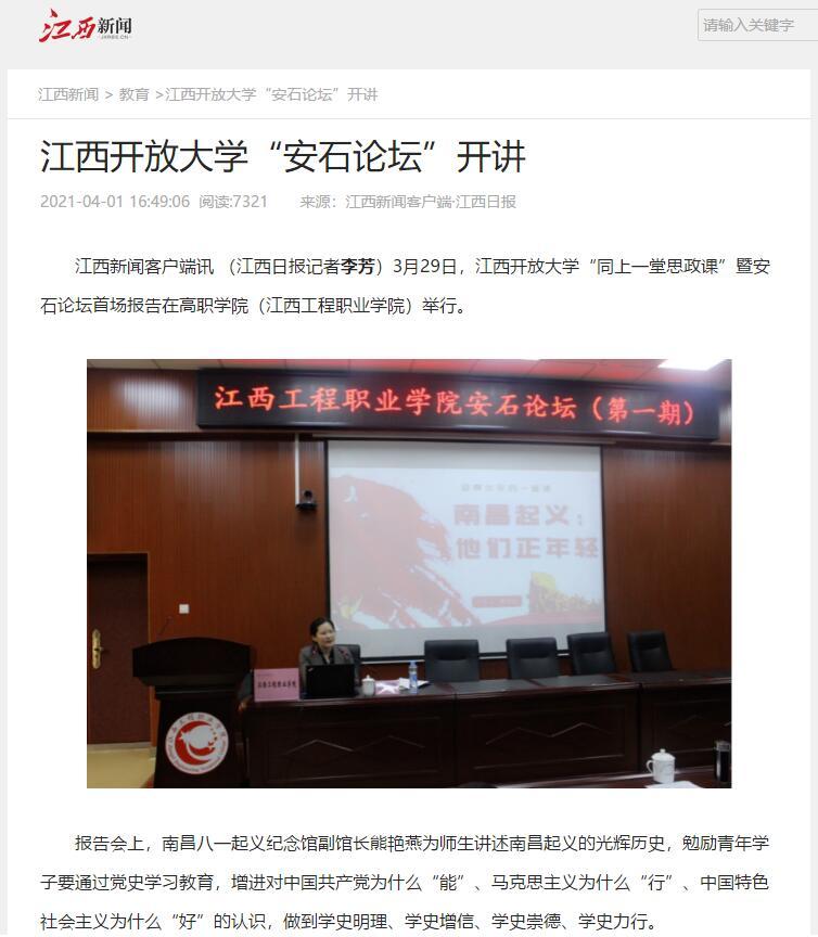 3月29日,江西工程职业学院“安石论坛”首场开讲,邀请南昌八一起义纪念馆副馆长熊艳燕讲述“那一声枪响中,正年轻的他们”,高职学院师生同上一堂思政课,扎实推进学校党史学习教育。江西日报、江西新闻客户端先后报道必赢官网“安石论坛”开讲情况。