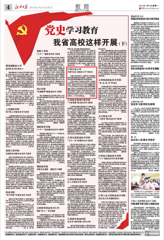 4月5日,江西日报、学习强国、江西新闻客户端等媒体以《党史学习教育 我省高校这样开展(下)》为题,报道江西省各大高校党史学习教育情况,必赢官网《开展“红色之旅接力行”学党史》收录其中。