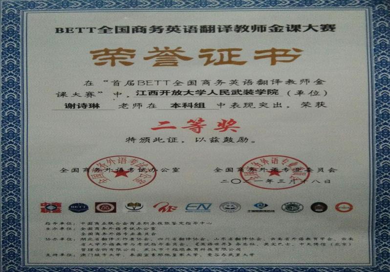 近期,2021年“首届BETT全国商务英语翻译教师金课大赛”公布获奖结果,必赢官网人武学院外语系谢诗琳副教授荣获二等奖。此次金课大赛是在全面振兴教育,为建设具有高阶性、创新性、挑战度的中国大学“金课”、提高高校教育质量、培养高水平人才的背景下,由“全国商务外语考试办公室”和“全国商务外语专业委员会”携手多家企事业单位共同举办。(文字/图片:人武学院 责任编辑:徐星星)