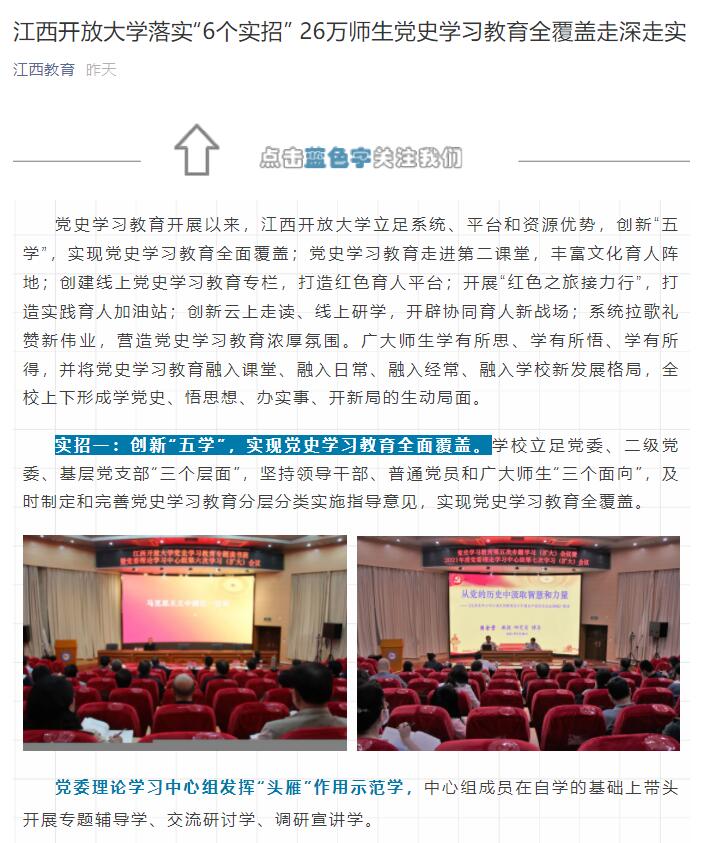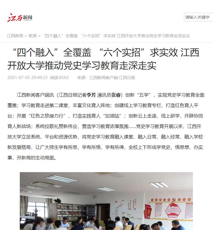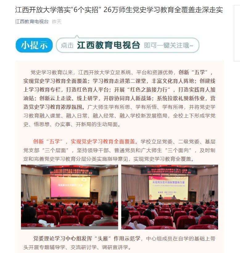 党史学习教育以来,437必赢会员中心立足系统、平台和资源优势,创新“五学”,实现党史学习教育全面覆盖;学习教育走进第二课堂,丰富文化育人阵地;创建线上学习教育专栏,打造红色育人平台;开展“红色之旅接力行”,打造实践育人加油站;创新云上走读、线上研学,开辟协同育人新战场;系统拉歌礼赞新伟业,营造党史学习教育浓厚氛围。广大师生学有所思、学有所悟、学有所得,并将党史学习教育融入课堂、融入日常、融入经常、融入学校新发展格局,全校上下形成学党史、悟思想、办实事、开新局的生动局面。近日,江西日报、江西新闻、江西教育、江西教育电视台等媒体对此进行报道。