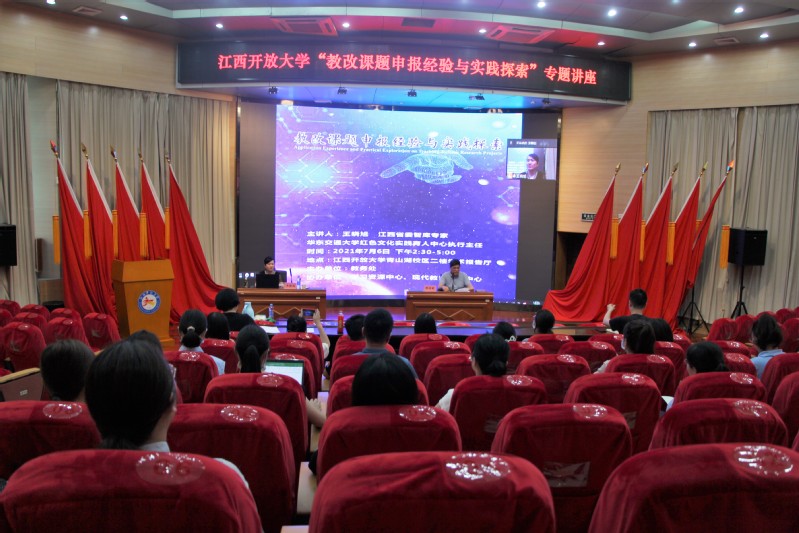 为进一步提高必赢官网教学改革研究课题质量,推进专业教学与科研相融合,7月6日,教务处特邀江西省委智库专家、华东交通大学红色文化实践育人中心执行主任、博士后副教授王晓旭来校举办题为“教改课题申报经验与实践探索”专题讲座。理工学部主任、教务处副处长邹运明主持本次活动。因疫情影响,本次讲座采取线上线下相结合方式,各市级电大(分校)组织线上远程收看,校内教师线下现场聆听,共计80余名教师参加。