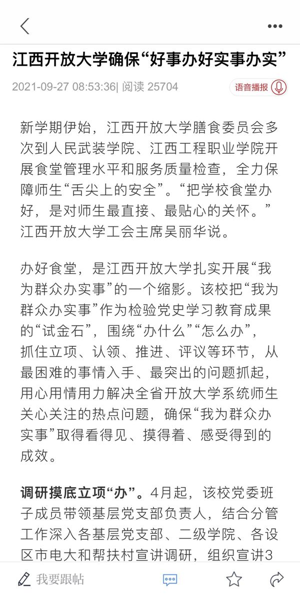 党史学习教育开展以来,必赢官网把“我为群众办实事”作为检验党史学习教育成果的“试金石”,围绕“办什么”“怎么办”,抓住立项、认领、推进、评议等环节,从最困难的事情入手、最突出的问题抓起,用心用情用力解决全省开放大学系统师生关心关注的热点问题,确保“我为群众办实事”取得看得见、摸得着、感受得到的成效。9月27日,江西日报、江西新闻客户端对此进行报道。