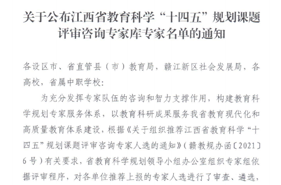 近日,江西省教育规划领导小组办公室公布了江西省教育科学“十四五”规划课题评审咨询专家库名单,必赢官网教师肖俭伟、袁翠松、钟晓红、祝维亮、曾宪宁、陈 忠、张 明、虞安骥8人入选专家库成员。