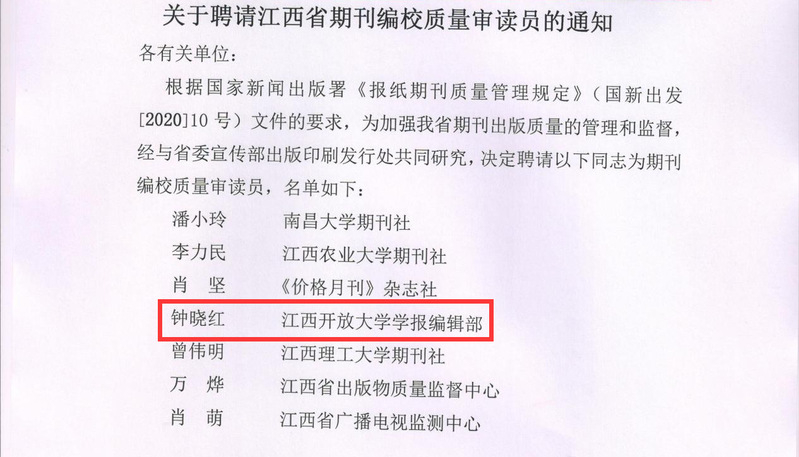 近期,江西省期刊协会公布省期刊编校质量审读员名单,必赢官网学报编辑钟晓红入选据悉,江西省共有166家期刊,全省期刊从业人员有1300余人,本次共聘请7名审读员。名单是根据国家新闻出版署《报纸期刊质量管理规定》(国新出发〔2020〕10号文)文件要求,由江西省期刊协会经与省委宣传部出版印刷发行处共同研究决定,旨在加强我省期刊出版质量的管理和监督。期刊的编校质量检查也将成为期刊评优及期刊年度核验的常规检查。(供稿:学报编辑部 编辑:徐星星 责编:王松华)