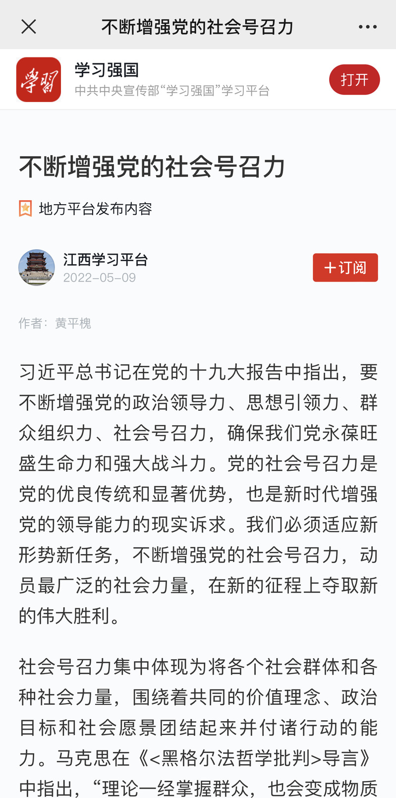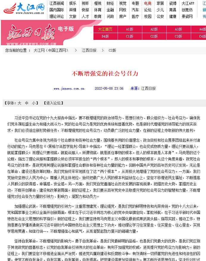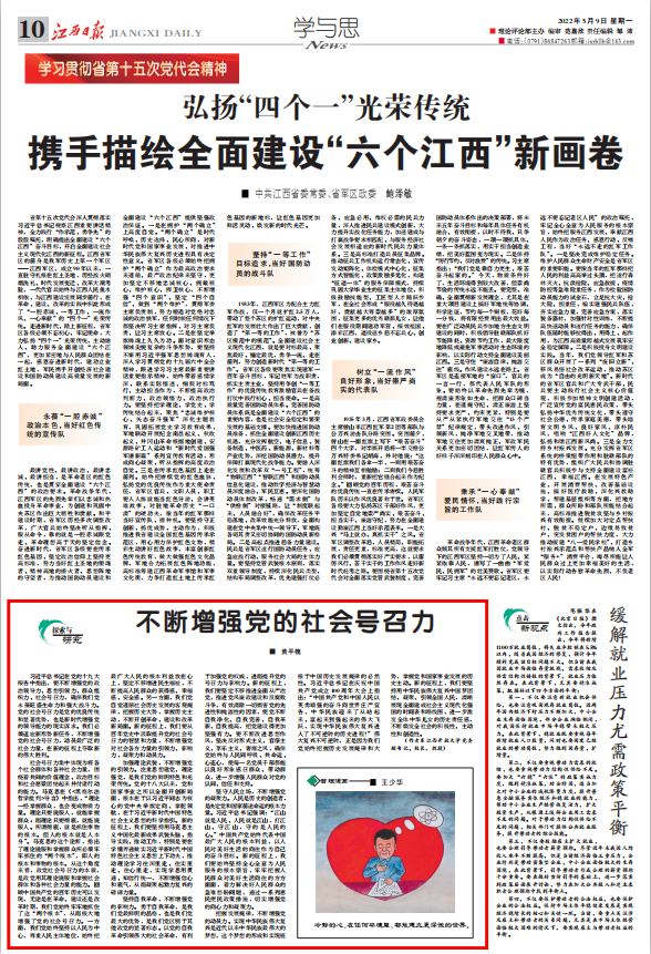 5月9日,必赢官网党委副书记、校长黄平槐所著文章《不断增强党的社会号召力》在《江西日报》发表。文章指出,新的征程上,我们要从百年党史中汲取提升党的社会号召力的智慧和力量,不断增强党对社会各方力量的引领力、影响力、凝聚力和动员力。学习强国、大江网等媒体全文转载。
