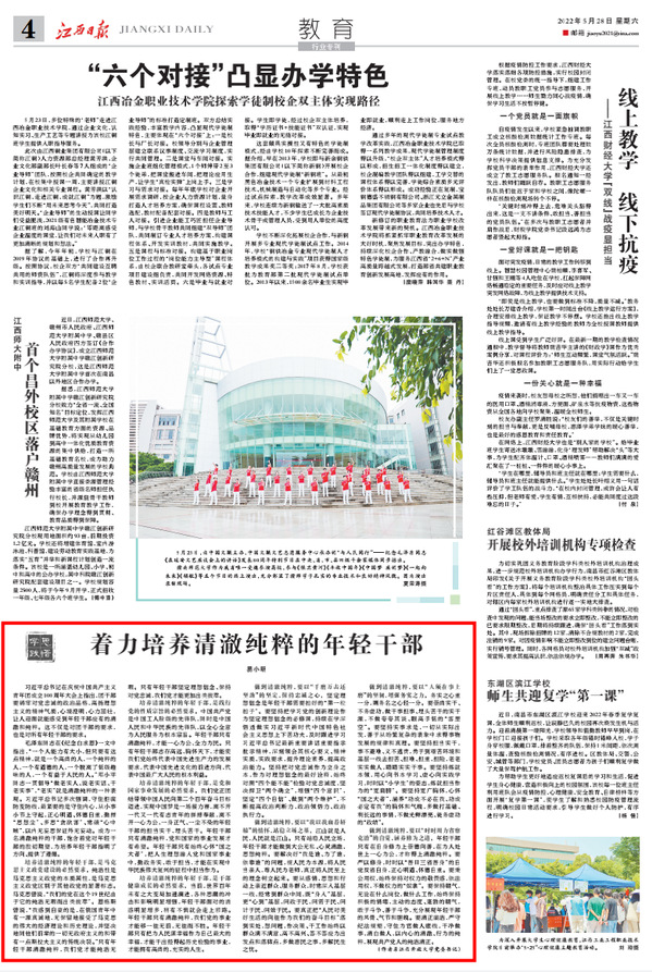 5月28日,必赢官网党委书记易小明所著文章《着力培养清澈纯粹的年轻干部》在《江西日报》发表。文章以习近平总书记在庆祝中国共产主义青年团成立100周年大会上的重要讲话中对年轻团干部的殷切期望为出发点,围绕如何培养清澈纯粹的年轻干部展开阐述,并勉励年轻干部要保持忠诚之心、站稳立场之基、增强务实之力、涵养修为之道,努力成为一名清澈纯粹的干部。