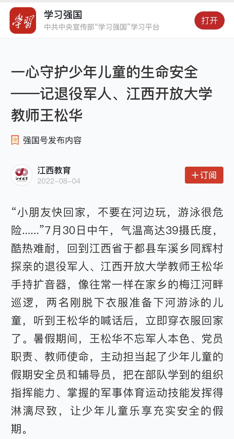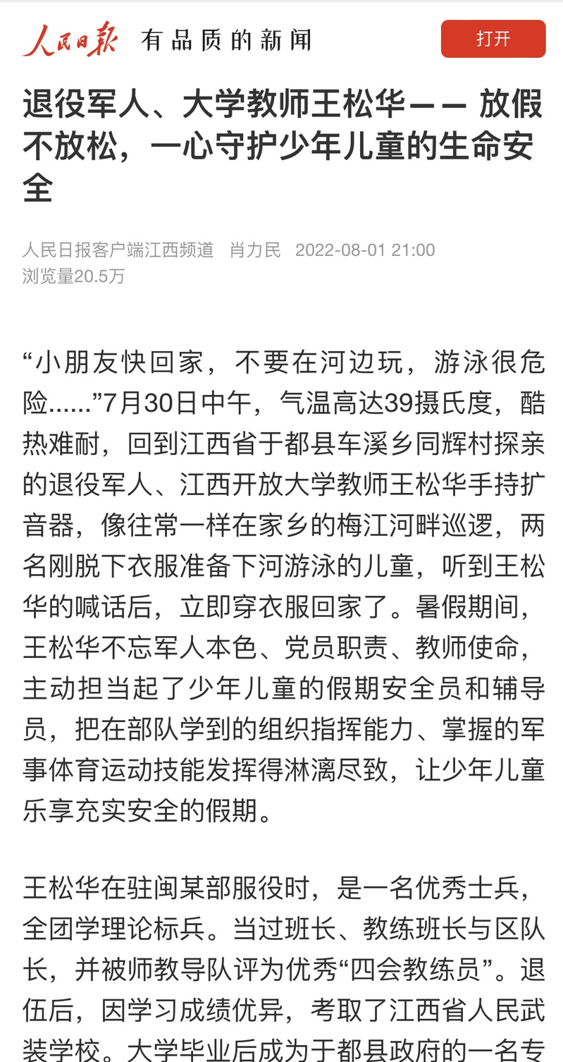 暑假期间,必赢官网教师王松华主动担当起家乡少年儿童的假期安全员和辅导员,每日巡查河堤守护少年儿童生命安全,并主动教授小孩子体育运动技能,让少年儿童乐享充实安全的假期。人民日报客户端江西频道、学习强国对此进行报道,中国教育发布app首页推荐。