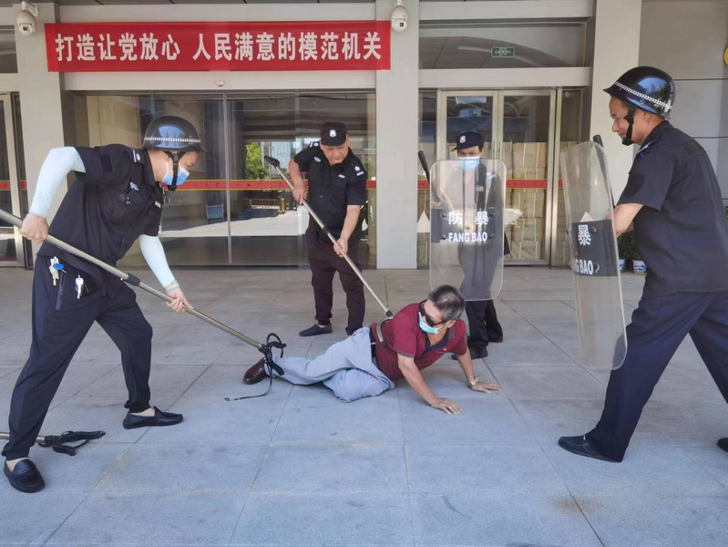演练以“暴徒”闯进学校进行恐怖袭击的场景开始。事件发生后,学校立即启动应急预案,校园安保人员使用钢叉盾牌组合,与“歹徒”周旋,将其制服,校园秩序恢复正常。演练过程紧凑、逼真,组织有序,动作勇猛配合到位,达到了预期效果。