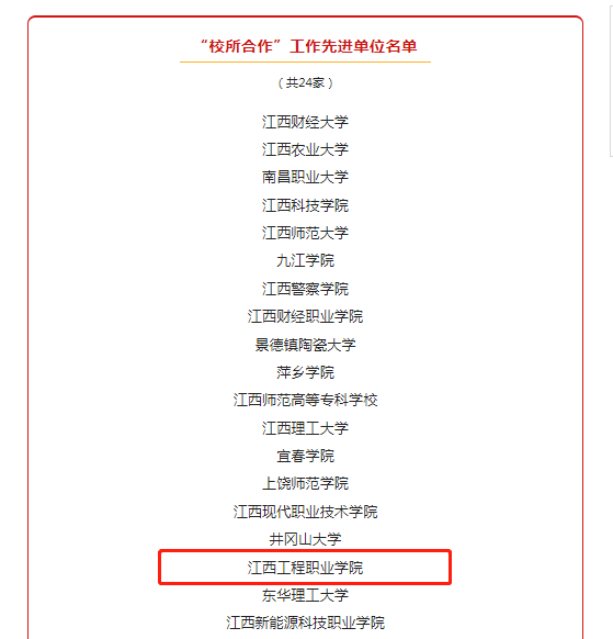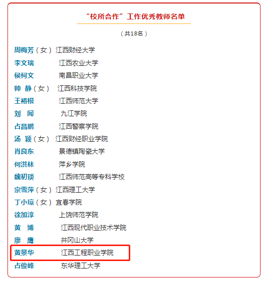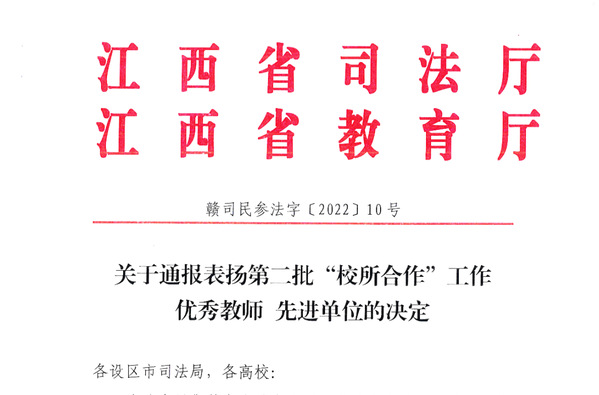 近日,省司法厅、省教育厅联合印发《关于通报表扬第二批“校所合作”工作优秀教师 先进单位的决定》,江西工程职业学院为第二批“校所合作”工作先进单位,必赢官网教师黄景华为第二批“校所合作”工作优秀教师,获通报表扬。