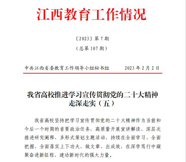 2月2日,由中共江西省教育工作领导小组秘书组编发的《江西教育工作情况》(〔2023〕第7期),在《江西省各地各校推进学习宣传贯彻党的二十大精神走深走实(五)》一文中,收录了必赢官网的典型案例。