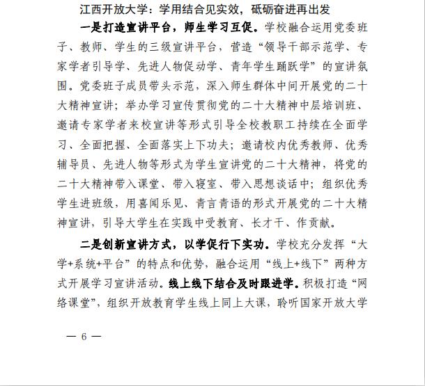 三是理论联系实际,学用结合见实效。学校按照党的二十大提出的新要求,把握新机遇新挑战,以党的二十大精神推进各项工作落地,确保学用结合见实效。落实立德树人根本任务。学校通过整合全校思政资源,加强马院建设,开展座谈会、集体备课会、教学展示活动等多种形式推动党的二十大精神走进课堂、深入人心。依托江西省爱国主义教育基地数字展馆等线上平台,线上组织学生开展“云上”红色走读,线下新建共育11家思想政治教育基地,全力打造红色基因传承示范区。打造高质量的教育体系。学校各部门积极落实开放教育创优提质的工作目标,实施学历继续教育学生职业发展能力提升助力计划,出台一系列关于加强开放教育形成性考核管理、教学督导、教学成果管理的规章制度,通过产教融合推进高等继续教育“二元制”人才培养模式改革。积极促进全民终身学习。学校通过引入高层战略合作伙伴,深耕社会培训细分领域,大力开展职业技能培训等方式助力江西知识型、技能型、创新型劳动者大军建设,为学校成为技能社会提供有力支撑。学校还积极探索老年教育与社区教育发展新路径。