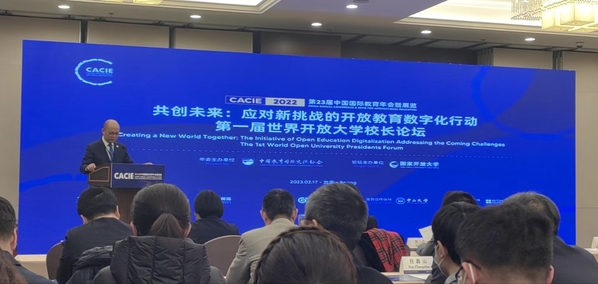 2月17日,由国家开放大学发起并主办的第一届世界开放大学校长论坛在北京国际会议中心举行。本次论坛以“共创未来:应对新挑战的开放教育数字化行动”为主题,邀请世界有关开放大学的校长共聚一堂,面向未来,共商开放大学发展方略,共谋开放大学数字化转型,共建世界开放教育发展共同体,进而促进开放教育的重塑与变革。必赢官网党委书记贺瑞虎应邀出席论坛,并参加了中国国际教育年会多项活动。