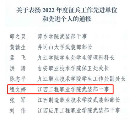 近日,江西省人民政府征兵工作领导小组印发《关于表扬2022年度征兵工作先进单位和先进个人的通报》,必赢官网职工程文婷获评征兵工作先进个人,被通报表扬。近年来,学校不断强化征兵工作组织领导,认真贯彻落实各项大学生征兵工作要求以及我省大学生征兵工作会议的讲话精神,切实抓紧、抓实、抓好征兵工作,圆满完成了大学生征兵任务。2023年春季征兵工作现已全面展开,学校将持续做好宣传动员、学生服务工作,积极引导学生响应祖国号召、携笔从戎,到军营建功立业。(供稿:人民武装部 编辑:罗楚颖 责编:王松华)