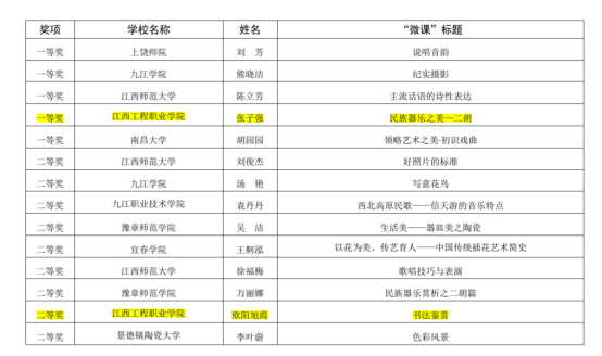 本届江西省高校美育教学展示活动,共评出高校公共艺术教育教师组一等奖15名、二等奖20名、三等奖15名。