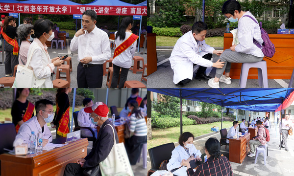 在讲座主会场,江西老年开放大学东湖校区设立了大型中西医义诊区域,邀请了南大二附医院心血管内科、神经内科、消化内科、神经外科、耳鼻喉科、中医科、内分泌代谢科7个科室专家,为参加讲座的中老年朋友提供免费义诊服务。义诊医生们细致地为大家进行健康查体,耐心解答各种健康养生问题,并根据义诊老年人不同体质和健康状态,科学提供了养生保健、疾病防治等意见。