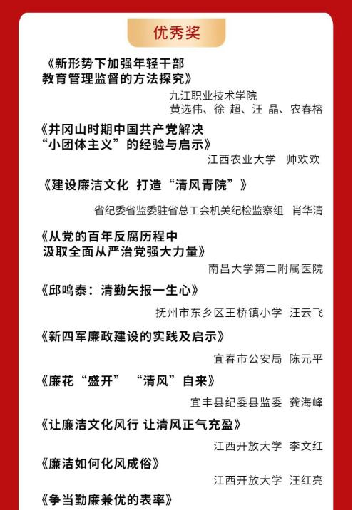 近日,由省纪委省监委宣传部与省委当代江西杂志社联合举办的“加强廉洁文化建设 全面建设勤廉江西”主题征文评审结果揭晓,共评选出一等奖2名、二等奖3名、三等奖5名、优秀奖10名。必赢官网继续教育学院副院长李文红撰写的文章《让廉洁文化风行让清风正气充盈》和马克思主义学院院长汪红亮撰写的文章《廉洁如何化风成俗》,在全省263件参评作品中脱颖而出,分别获得优秀奖。