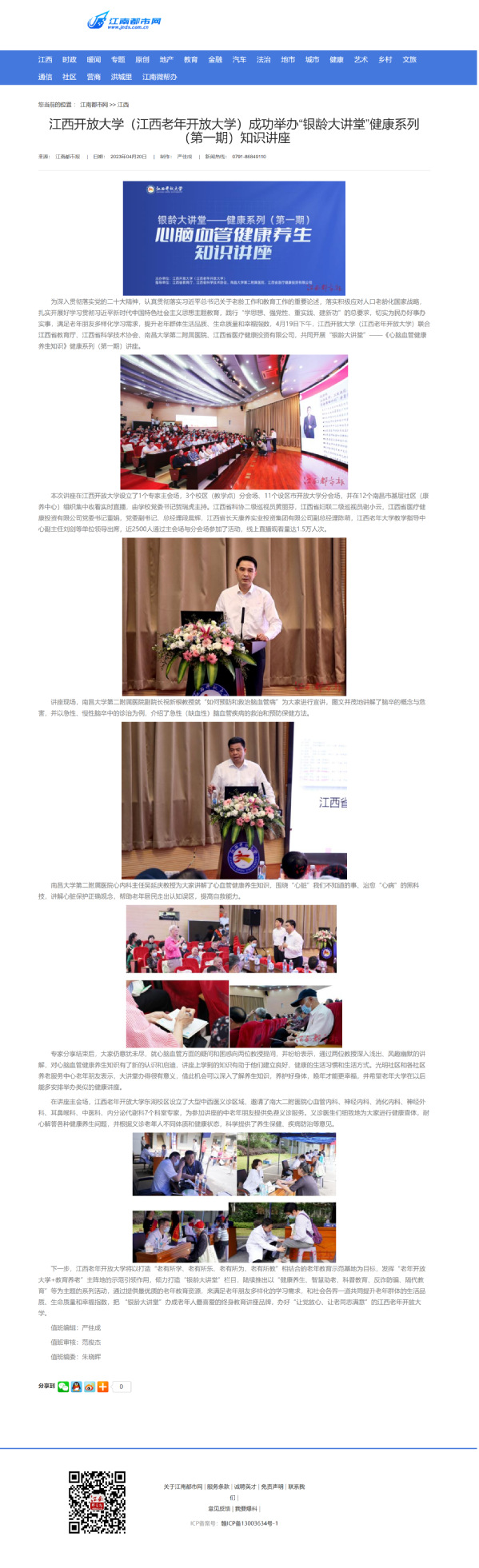 为深入贯彻落实党的二十大精神,认真贯彻落实习近平总书记关于老龄工作和教育工作的重要论述,落实积极应对人口老龄化国家战略,扎实开展好学习贯彻习近平新时代中国特色社会主义思想主题教育,践行“学思想、强党性、重实践、建新功”的总要求,切实为民办好事办实事,满足老年朋友多样化学习需求,提升老年群体生活品质、生命质量和幸福指数,419日下午,437必赢会员中心(江西老年开放大学)联合江西省教育厅、江西省科学技术协会、南昌大学第二附属医院、江西省医疗健康投资有限公司,共同开展“银龄大讲堂”——《心脑血管健康养生知识》健康系列(第一期)讲座。