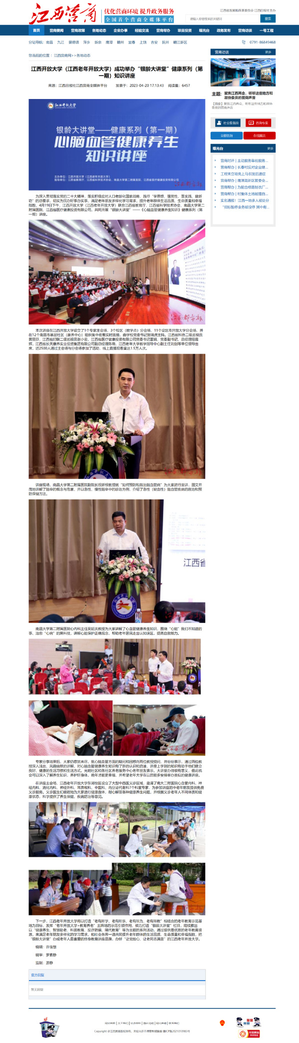 为深入贯彻落实党的二十大精神,落实积极应对人口老龄化国家战略,践行“学思想、强党性、重实践、建新功”的总要求,切实为民办好事办实事,满足老年朋友多样化学习需求,提升老年群体生活品质、生命质量和幸福指数,4月19日下午,437必赢会员中心(江西老年开放大学)联合江西省教育厅、江西省科学技术协会、南昌大学第二附属医院、江西省医疗健康投资有限公司,共同开展“银龄大讲堂”——《心脑血管健康养生知识》健康系列(第一期)讲座。