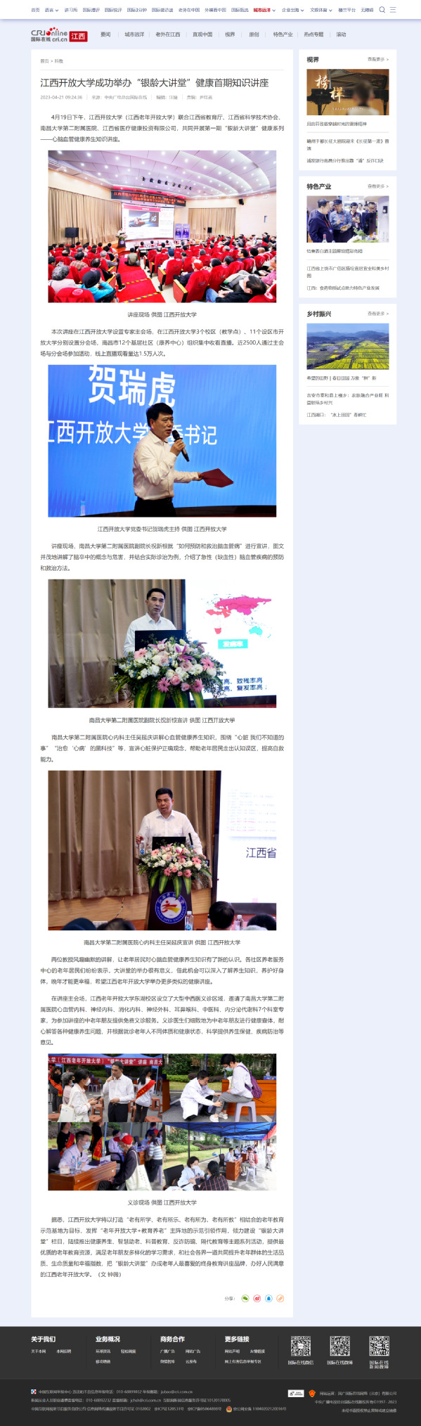 419日下午,437必赢会员中心(江西老年开放大学)联合江西省教育厅、江西省科学技术协会、南昌大学第二附属医院、江西省医疗健康投资有限公司,共同开展第一期“银龄大讲堂”健康系列——心脑血管健康养生知识讲座。