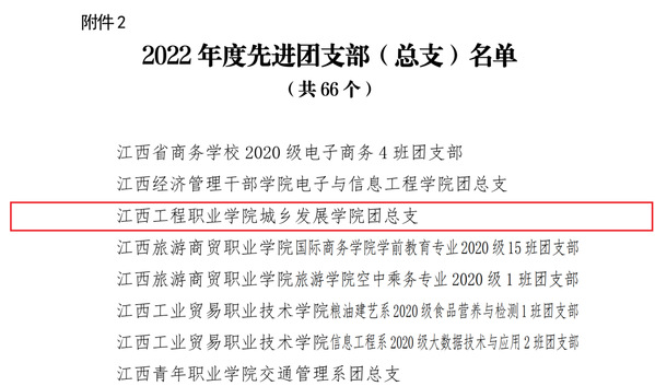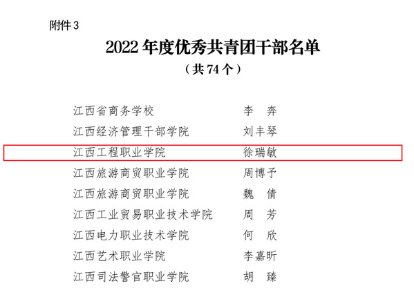 近日,江西省职业院校共青团工作协会公布了《关于表彰江西省职业院校共青团工作协会2022年度先进团委、先进团支部(总支)、优秀共青团干部、优秀共青团员的决定》,必赢官网城乡发展学院团总支获评“先进团支部(总支)”,徐瑞敏老师获评“优秀共青团干部”,数字经济学院学生李嘉俊获评“优秀共青团员”。