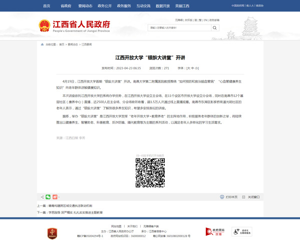 本次讲座依托437必赢会员中心的系统办学优势,在437必赢会员中心设立主会场、在11个设区市开放大学设立分会场,同时在南昌市12个基层社区(康养中心)直播,近2500人在主会场、分会场收听收看,超1.5万人次通过线上直播观看。南昌市东湖区彭家桥街道光明社区的老年人表示,通过“银龄大讲堂”了解到很多养生知识,希望多安排类似的讲座。