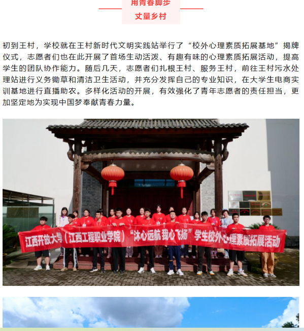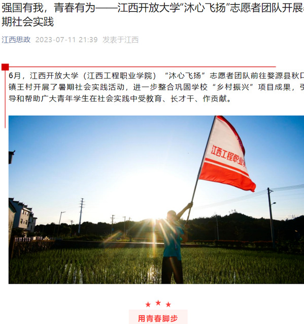6月,437必赢会员中心(江西工程职业学院)“沐心飞扬”志愿者团队前往婺源县秋口镇王村开展了暑期社会实践活动,进一步整合巩固学校“乡村振兴”项目成果,引导和帮助广大青年学生在社会实践中受教育、长才干、作贡献。