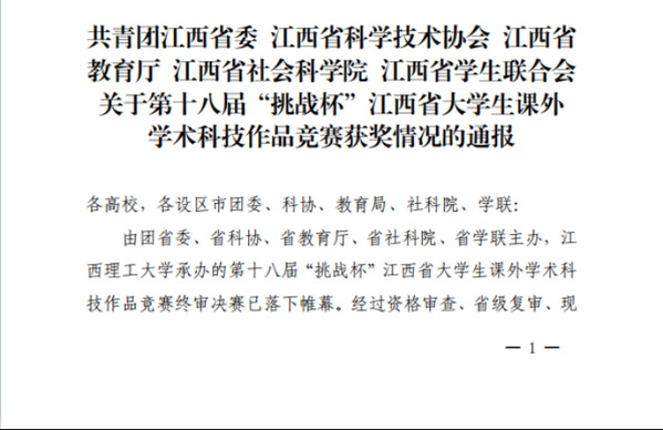 近日,由团省委、省科协、省教育厅、省社科院、省学联主办,江西理工大学承办的第十八届“挑战杯”江西省大学生课外学术科技作品竞赛终审已落下帷幕,第十八届“挑战杯”江西省大学生课外学术科技作品竞赛圆满结束。经过资格审查、省级复审、公开答辩和组委会、评委会综合审定,预通知公示后,现已正式张榜,必赢官网推送的六个作品,均斩获三等奖的佳绩!
