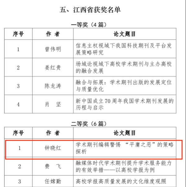 经各期刊社积极推荐、协会各工作委员会初评、协会专家评委复评、华东地区期刊出版研究优秀论文评审委员会终评,江西共有20篇论文入选华东地区期刊“优秀论文”,其中一等奖4篇、二等奖6篇、三等奖10篇,必赢官网学报编辑钟晓红编审的参评论文《学术期刊编辑警惕“平庸之恶”的策略探析》荣奖二等奖。
