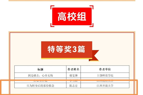 为庆祝39个教师节,江西省教育工会面向全省教职工启动了“中国梦·劳动美——凝心铸魂跟党走团结奋斗新征程”征文活动,必赢官网教师陈志宏的作品《只为那转身后的惦念》获得本次大赛高校组特等奖。