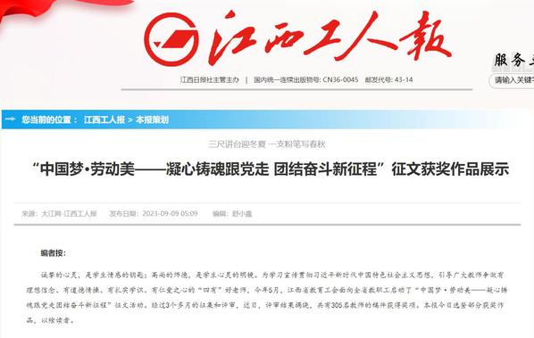 为庆祝39个教师节,江西省教育工会面向全省教职工启动了“中国梦·劳动美——凝心铸魂跟党走团结奋斗新征程”征文活动,必赢官网教师陈志宏的作品《只为那转身后的惦念》获得本次大赛高校组特等奖。近日,《江西工人报》刊登此作品。