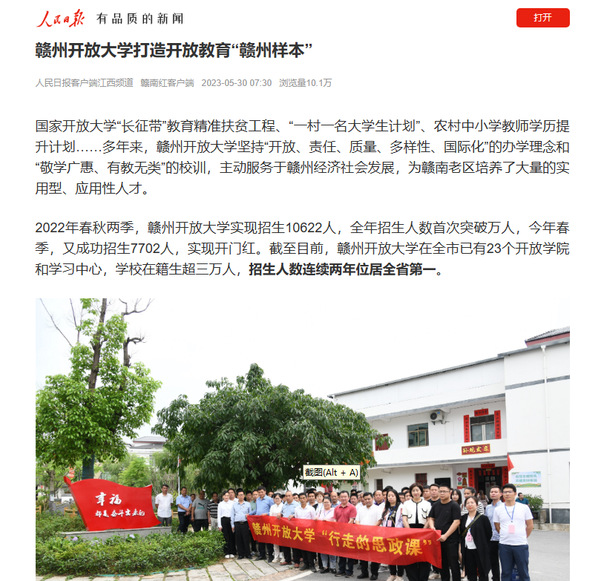 江西分部高度重视发挥体系办学这一独特优势,按照教育部有关开放大学“两级统筹、四级办学”体系运行要求,做强省级开放大学的统筹职能,做大市级开放大学的办学规模,做实县级开放学院的办学条件,夯实办学体系的“纵向支撑”。在全国45所省级开放大学中,是办学体系最为完备的省级开放大学之一。加快原广播电视大学办学系统的“旧城改造”,主动对接融入粤港澳大湾区建设、贯彻落实“两山”理念、服务“乡村振兴”战略,与地方政府、企业合作共建,先后设立了龙南新兴产业人才学院、上犹绿色发展人才学院、产业人才与乡村振兴学院等三个直属产业学院,为我省产业转型和绿色发展培养应用型技术人才,稳步推进办学体系转型发展。以服务地方经济社会发展和产业转型为导向,鼓励和支持各市级开放大学错位发展、特色发展、创新发展,萍乡开放大学传承安源精神、赓续红色血脉,以“引领力+倒逼力+凝聚力”三力拉动、“以德育德+从严治考+用心服务”三轮驱动,打造了“以德育德、过程育能、服务育情”的人才培养“萍乡模式”;赣州开放大学主动融入全市经济社会发展格局,推动各县(市、区)开放学院与本地区域发展融合,积极探索“开放教育+”发展模式,成立赣州开放大学乡村振兴人才学院,承担村、居“两委”干部学历提升工程人才培养任务;加强校企、校协、校商合作,与华为等行业头部企业签订合作协议,为赣南老区培养大量实用型、应用型人才。“萍乡模式”“赣州样本”获得国家开放大学肯定,并向全国市级开放大学推介。