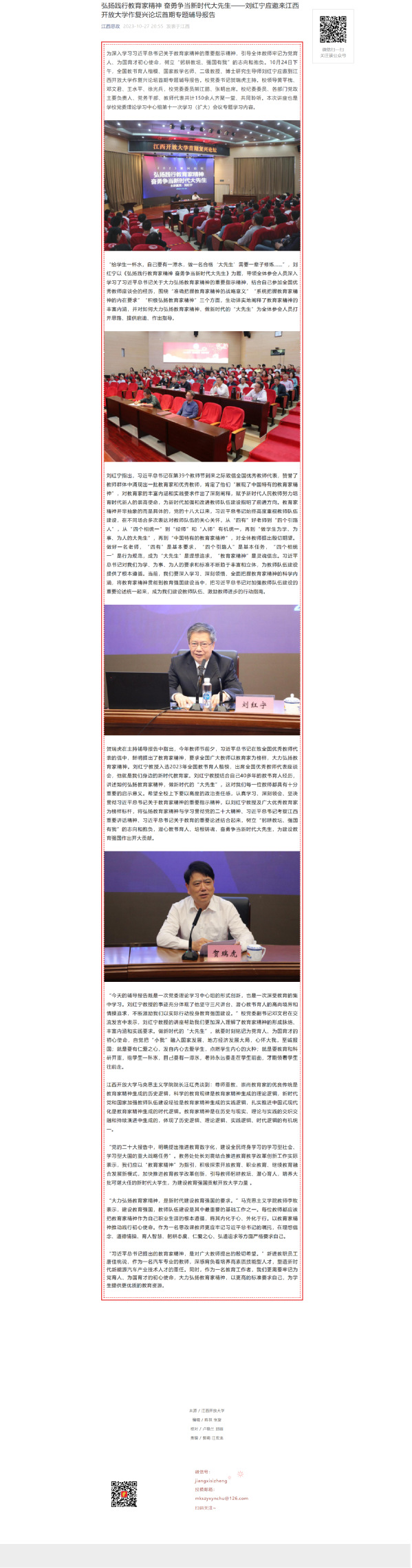为深入学习习近平总书记关于教育家精神的重要指示精神,引导全体教师牢记为党育人、为国育才初心使命,树立“躬耕教坛、强国有我”的志向和抱负。10月24日下午,全国教书育人楷模、国家教学名师、二级教授、博士研究生导师刘红宁应邀到437必赢会员中心作复兴论坛首期专题辅导报告。校党委书记贺瑞虎主持。校领导黄平槐、邓文君、王水平、徐光兵,校党委委员熊江鹏、张明出席。校纪委委员、各部门党政主要负责人、党务干部、教师代表共计150余人齐聚一堂、共同聆听。本次讲座也是学校党委理论学习中心组第十一次学习(扩大)会议专题学习内容。