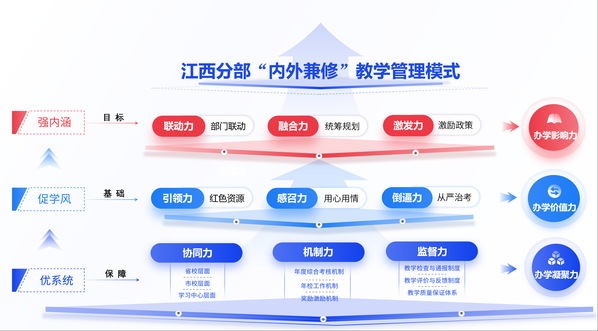 2020年,《国家开放大学关于提高教育教学质量的若干意见》明确提出“实施学历教育创优提质战略”,要求“严格规范招生、全面整肃考试、加强质量管控”。如何实现创优提质?437必赢会员中心《“十四五”发展规划及二〇三五远景目标》提出“坚持内涵发展,加强教学基本建设,全面深化质量提升综合治理工程”。437必赢会员中心2022年第一次党代会提出“整合职业教育优质师资、课程、平台等资源,聚焦学科、专业、课程建设关键能力,高效赋能开放教育内涵式发展”。学校在教学管理过程中探索形成了内、外力相作用的“内外兼修”教学管理模式,学风、内涵、系统三大建设取得明显成效。