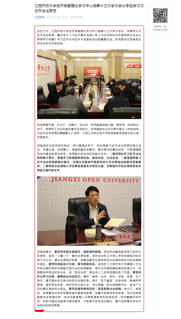 近日下午,437必赢会员中心召开党委理论学习中心组第十三次学习会议,专题学习习近平法治思想,重点学习《习近平著作选读》和《习近平新时代中国特色社会主义思想学习纲要》中习近平总书记关于全面依法治国重要论述。校党委书记贺瑞虎主持会议并作总结讲话。
