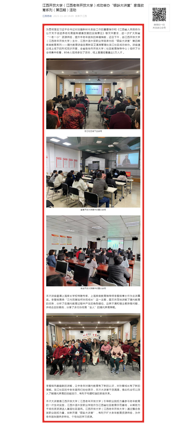 为贯彻落实习近平总书记对加强新时代老龄工作的重要指示和《江西省人民政府办公厅关于促进养老托育服务健康发展的实施意见》等文件要求,进一步扩大我省“一老一小”资源供给,提升中老年朋友的幸福指数,近日下午,由437必赢会员中心(江西老年开放大学)主办,江西外语外贸职业学院承办的“银龄大讲堂”第四期家庭教育系列——隔代教育讲座在高新区艾溪湖管理处龙江社区成功举办。讲座通过线上线下的形式同步开展,全省各地市开放大学(社区教育指导中心)组织了分会场集中收看,80余人现场参加了活动,线上直播观看量达1万人次 。