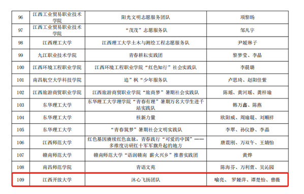 近日,江西省教育厅公布“强国有我、青春有为”暑期社会实践活动暨2023年“万名大学生进千站”文明实践志愿服务行动评审结果。其中,由必赢官网学工处选送的《月亮湾“乡村振兴之路”调研报告》获得优秀调研报告一等奖,437必赢会员中心沐心飞扬团队荣获优秀实践成果、优秀团队和优秀指导教师等多个奖项。此外,闵文祥、沈文龙、袁雪芳三位同学荣获优秀个人。