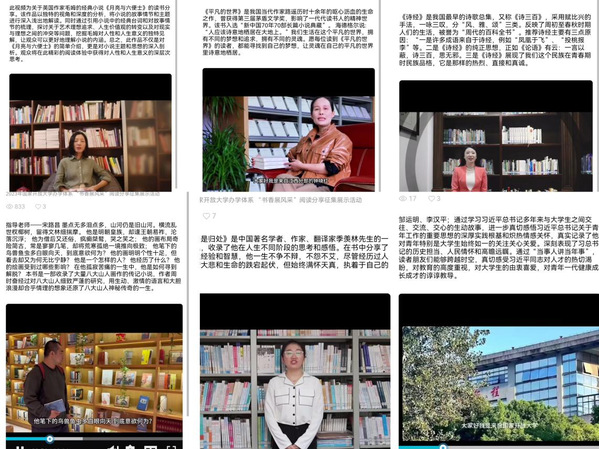 “荐书分享”征集展示活动以线上形式进行。师生通过录制视频分享自己的读书心得和感悟。活动特别邀请校领导、图书馆馆长、师生代表参与其中,18个作品参加线上展示。