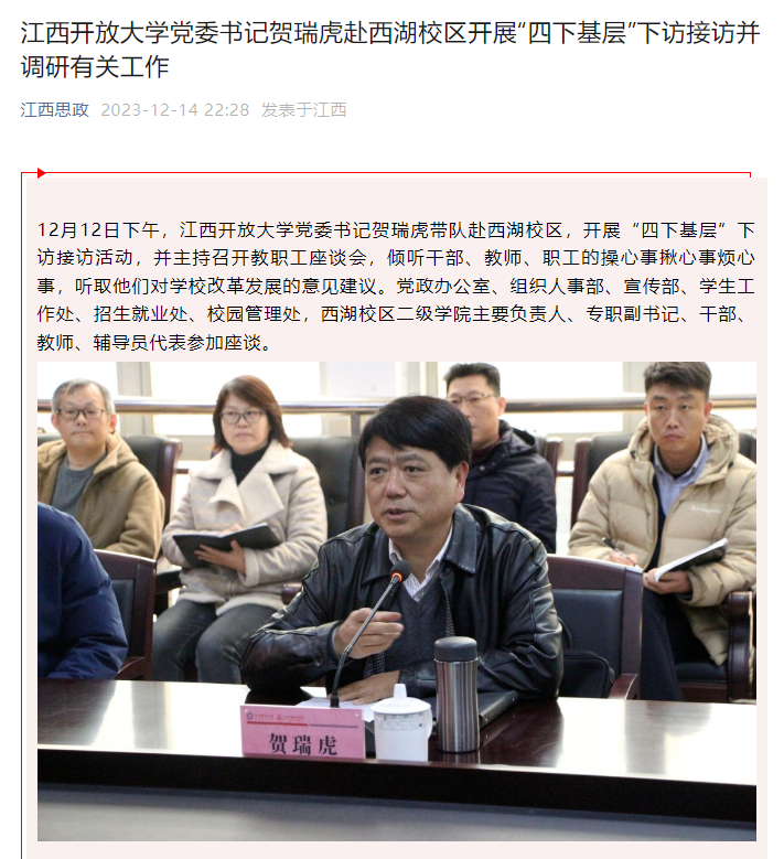 12月12日下午,437必赢会员中心党委书记贺瑞虎带队赴西湖校区,开展“四下基层”下访接访活动,并主持召开教职工座谈会,倾听干部、教师、职工的操心事揪心事烦心事,听取他们对学校改革发展的意见建议。党政办公室、组织人事部、宣传部、学生工作处、招生就业处、校园管理处,西湖校区二级学院主要负责人、专职副书记、干部、教师、辅导员代表参加座谈。