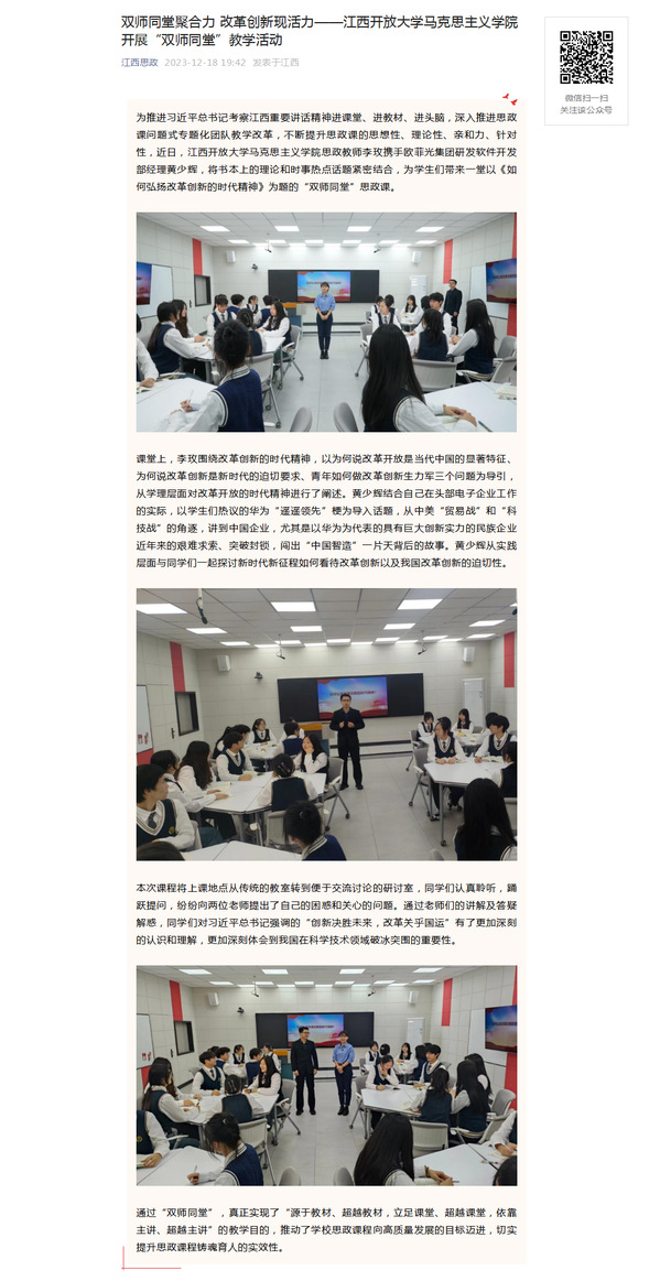 为推进习近平总书记考察江西重要讲话精神进课堂、进教材、进头脑,深入推进思政课问题式专题化团队教学改革,不断提升思政课的思想性、理论性、亲和力、针对性,近日,437必赢会员中心马克思主义学院思政教师李玫携手欧菲光集团研发软件开发部经理黄少辉,将书本上的理论和时事热点话题紧密结合,为学生们带来一堂以《如何弘扬改革创新的时代精神》为题的“双师同堂”思政课。